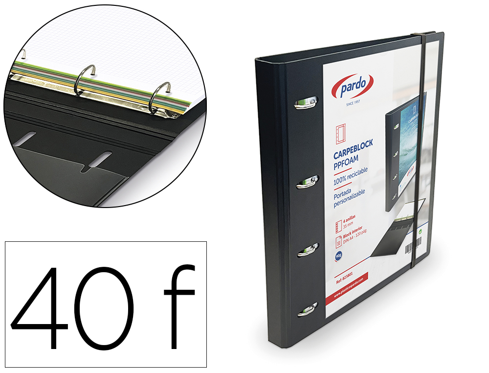 - Formato e dimensões: Concebido para folhas DIN A4 (210 x 297 mm), com capacidade suficiente graças aos seus anéis de 25 mm de diâmetro.